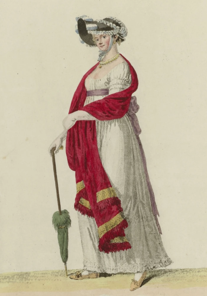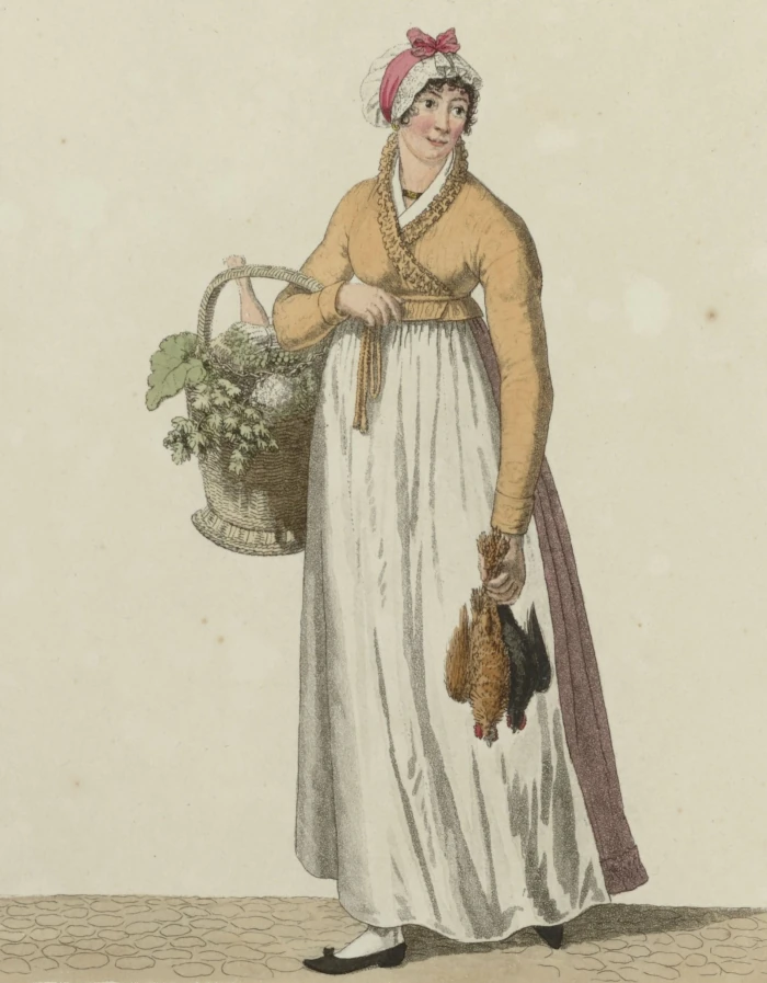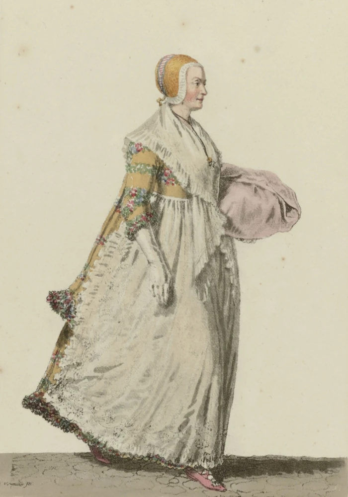 Das Aeußere der Einwohner von Dresden, niederer und mittler Klassen, ist anständiger und sauberer, als man es in andern großen Städten, z. B. in Berlin, an eben diesen Klassen findet. Eine Handwerkersfrau, Soldatenfrau, Magd, die zu Markte geht, ist schier und weiß angezogen, und der Korb oder das Tuch, worin sie die eingekauften Waaren trägt, ist niedlich, reinlich, und in die Augen fallend. Diese Klasse ist Winter und Sommer in Kotton, Kamelot und ähnlichen Stoff gekleidet; Korsett und Rock sind von einem und demselben Zeuge; dazu trägt sie eine saubere Schürze. Die Haube ist von weißem, baumwollenen Zeuge, mit einem farbigten, seidnen Bande umschlungen, wozu, hauptsächlich im Winter, ein Mützchen, mit Marder oder Zobel eingefaßt und mit einer herabhangenden Klappe und Gold-Quaste versehen, auf den Kopf gestülpt wird, das, in seiner Art, nicht minder gut steht, als der schwarze sammetne Kopfputz der Breslauer Schließerinnen und der Reichsstadt-Schweinfurter Stubenmädchen. Eine Stube höher, erscheinen Kontuschen, die mit einer sehr kurzen Taille versehen sind, und tief herunter den Rock bedecken; sie begleiten schon zusammen gesetztere, größere Hauben von Klar, mit Spitzen und, des Sonntags, mit Blumen verziert, aber ohne Frisur darunter; und dies ist besonders die Tracht der Weiber und Mädchen, deren Männer und Väter bey Hofe oder bey irgend einer Herrschaft, Bediente, Läufer, Kutscher u. dgl. sind.