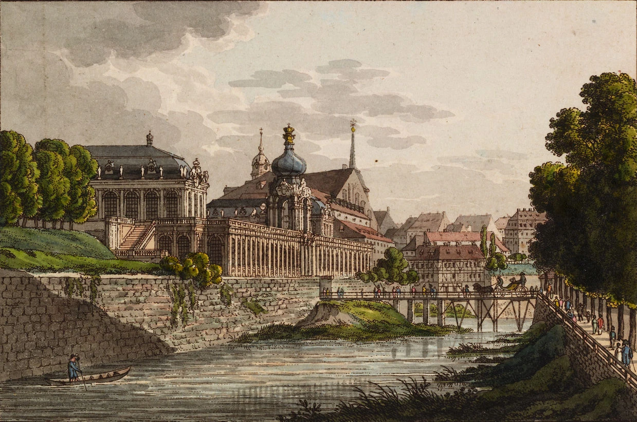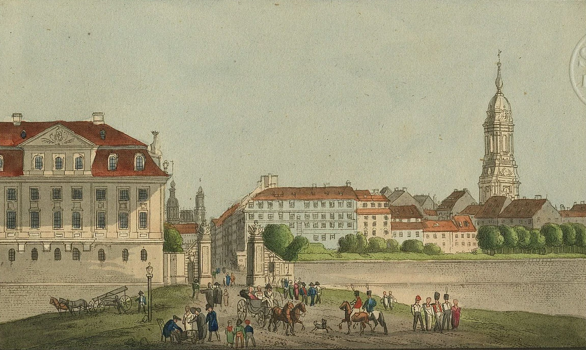 Verfügt man sich nach der andern Seite der Neustadt hinüber, so tritt man, gleich hinter der Kirche, in die Königsstraße, die mit ansehnlichen, meist gleich hohen und langen Häusern besetzt ist und "en face" den sogenannten Japanischen Pallast hat, aber todt und menschenleer ist. Der Platz, worauf jener Pallast steht, ist nicht wohl unterhalten, und schwimmt, wenn es geregnet hat, in Wasser und Koth, wozu die starke Durchfahrt, zum weißen Thor herein und hinaus, nicht wenig beiträgt. Der Pallast selbst fällt nicht übel in die Augen, nur wünscht man, daß er für seinen Umfang mehr Höhe und Leichtigkeit haben möchte. Das Innere desselben ist jetzt zu der vortrefflichen Bibliothek eingerichtet, und nicht leicht wird sich irgend ein Institut dieser Art, die Bibliothek zu Paris und im Vatikan ausgenommen, solch eines prächtigen, heitern, geschmackvollen und weitläuftigen Lokals rühmen können. Auch für die Kunst verwahrt es einen bedeutenden Schatz von antiken Bildhauereyen und von Gypsen; es ist aber bey weitem noch nicht ganz ausgefüllt. Die Aussicht von den obern Sälen ist vortreflich. Am Pallaste selbst ist ein kleiner, aber sehr artiger Garten, dessen Terrassen zugleich ein Stück des Walles einnehmen und einen köstlichen Ueberblick über die umliegenden Gegenden und den ganzen Spiegel der Elbe, die hart daran hinfließt, gewähren. Mit einem Worte, die Musen haben hier einen höchst anmuthigen Zufluchtsort gefunden.