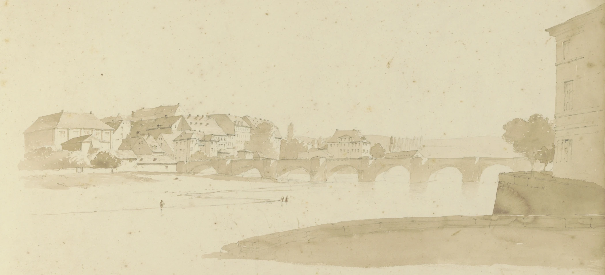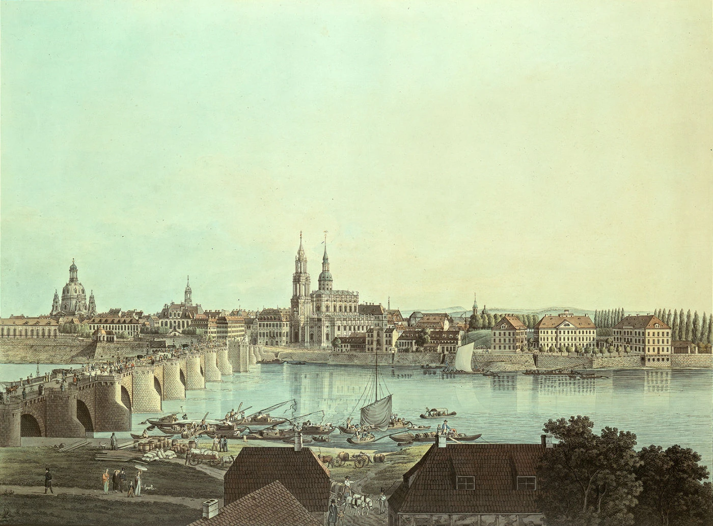 Dies wäre ein leichter Umriß von dem Aeußern der Altstadt Dresden, den ich von meiner ersten Ausflucht mit zurückbrachte. Meine zweite betraf die Neustadt, die durch die Elbe von der Altstadt getrennt, aber mittelst der Brücke mit ihr wiederum verbunden wird. Die Brücke hat einen gepflasterten Fahrweg und zwey erhöhete, mit Fliesen ausgelegte, Trottoirs für die Fußgänger. Wer nach der Neustadt geht, schlägt das Trottoir rechter Hand ein, wer aus der Neustadt kommt, nimmt auch das, welches ihm rechter Hand ist, und so kommt und geht man von beyden Seiten ungehindert. Die Schildwachen auf der Brücke haben über diese Ordnung zu wachen.