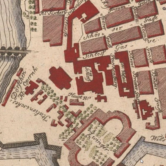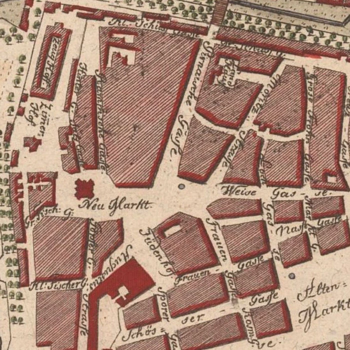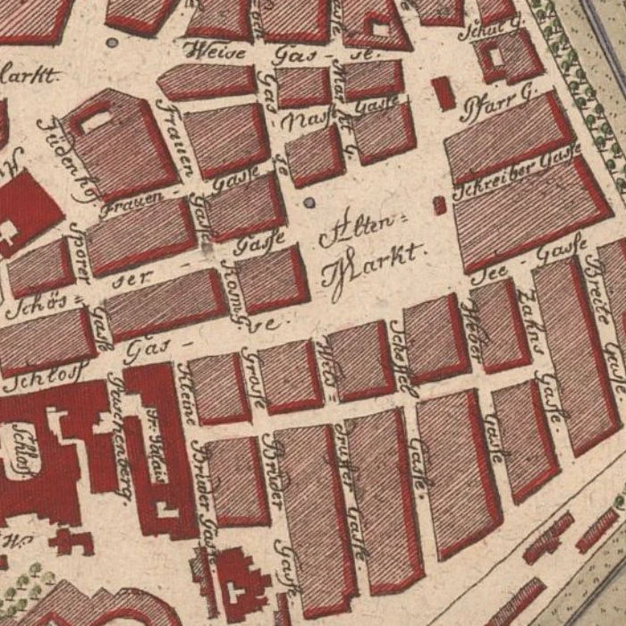 2) Sporergasse, und queer über die Schössergasse; so langt man wieder auf der Schloßgasse an. Geht man aber bey dem Jüdenhofe vorüber, am Neumarkte hin; so zeigt sich