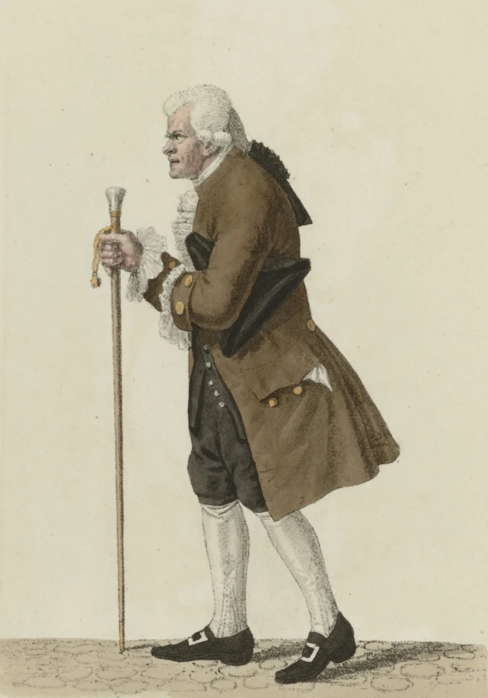 Die Männer dieser Klasse prunken noch häufiger, des Winters, mit Sammet- und Manschesterkleidern, des Sommers, mit verblaßten, färbig-gefütterten Seidenröcken, mit Tressenhüten, goldnen Beingürteln, sorgsam gefetteten und dickgepuderten Beutelperücken, großen spanischen Röhren, oder auch wie alte Hofmänner, den silbernen oder tombackenen Degen an der Seite, den Sonnenschirm in der Hand und den platten, zerriebenen Hut von Pferdehaar unter dem Arme. Der Englische Frack, der geschorne Wirbel und das gestutzte Seitenhaar, die in andern großen Städten von Deutschland die Kaufmannsklasse, die jüngern Dikasterianten u. dgl. seit mehreren Jahren schon in Besitz genommen haben, finden sich hier noch äußerst selten und werden nur höchstens den jungen Zöglingen der hiesigen Malerakademien verziehen. Ewige Chapeaubas-Träger sind hier die ältern Hofherren und Hofbedienten, die Kandidaten der Theologie, die man hier durchweg "Magistros" nennt, und die Räthe, Registratoren, Kalkulatoren und Sekretarien, die schon gewisse Jahre haben.