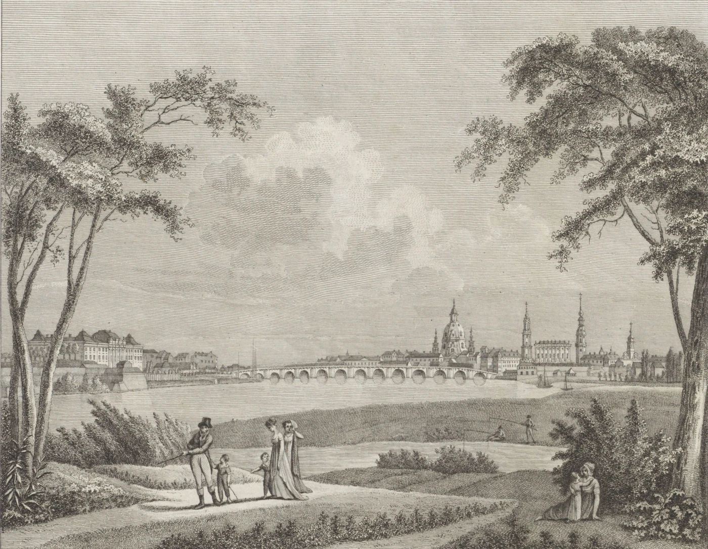 Der Eintritt in Dresden von dieser Seite, ist glänzend und überaus heiter. So wie man innerhalb des Thores ist, dehnt sich links ein Flügel der ansehnlichen Artillerie-Kaserne aus, und rechts behält man die Kirche, die in einem guten Geschmack erbauet, aber ohne Thurm ist. An den Platz zwischen beyden lehnt sich eine breite Straße, deren Mitte mit einer wohlunterhaltenen Allee besetzt und mit Geländern eingefaßt ist. Sie hat fast die ganze Länge der Neustadt und läuft in einen Platz aus, worauf die von Kupfer getriebene, vergoldete Statuë August des Ersten zu Pferde auf einem angemessenen Fußgestelle von Werkstücken stehet. Die Hauptwache, die gut in die Augen fällt, und ansehnliche Bürgerhäuser, umschließen rechts und links diesen Platz. Von demselben tritt man unmittelbar auf die große Elbbrücke, die in Absicht ihrer Länge, Breite, Sauberkeit und Festigkeit, immer eine der prächtigsten in Europa bleiben wird, wenn auch unter den Brücken in Italien, z. B. in Pisa und Florenz, die zugleich von Marmor sind, einige gefunden werden sollten, die sie, besonders in Leichtigkeit der Bauart, überträfen. Die Aussicht von dieser Brücke herab ist köstlich, und man überblickt den Lauf der Elbe, oberhalb Dresden und unterhalb dieser Stadt, in einer ansehnlichen Entfernung. Die Bergrükken, die sie, näher oder entfernter, auf beyden Seiten einschließen, sind theils mit Wald, theils mit Reben besetzt, und unter letztern sieht ein Gewimmel von kleinern und grössern Land- und Lusthäuschen hervor. Ist man über die Brücke herüber, so hat man die Schloßkapelle vor sich, die, trotz ihrer Ueberladung an Bildsäulen, die nicht alle Meisterstücke sind, mit einer gewissen Pracht in die Augen fällt; ferner das churfürstliche Schloß, das freylich, seines Alters wegen, ein wenig stark gegen jene absticht; ferner links die Terrassen des Brühlischen Gartens, für den man keine glücklichere Lage hätte finden können; weiterhin das ehemalige Brühlische Palais, und dem gegenüber die Stallgebäude, in deren oberen Geschoß sich die berühmte Gemälde-Gallerie befindet. Sodann gelangt man auf einen der schönsten Plätze in Dresden, den Neumarkt, auf welchem die ganz von Werkstücken, ein wenig schwerfällig, aufgewölbte Frauenkirche stehet, die nächstens an einer neuen Hauptwache, zu deren Bau schon Anstalten gemacht werden, eine Nachbarin erhalten soll, die diesen Platz, der übrigens von meist fünfstöckigen Häusern umschlossen ist, vortreflich zieren helfen wird. Hier bezog ich eine Wohnung in dem "Hotel de Saxe," einem Gasthofe der zweyten Ordnung zwar, aber unter allen übrigen in Dresden am besten gelegen.