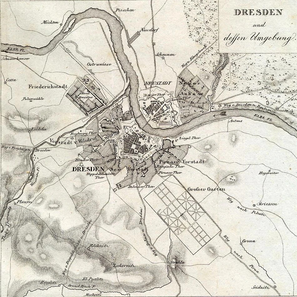 Mit der Altstadt hängt die Friedrichsstadt durch eine schöne Allee zusammen, die sich am Zwinger endigt. Die Wilsdruffer Vorstadt, in der man sich nun befindet, ist stark von Gerbern bewohnt und in ihrer Nähe, wie es sich gebührt, befindet sich auch das Schlachthaus. Der größeste Theil dieser Vorstadt ist gut gebauet und sauber. Derselbe Fall ist es mit der Seevorstadt, die besonders einige vortrefliche Gärten einschließt. Schöner als beyde, ist die Pirnaische Vorstadt, die einige Häuser aufzuweisen hat, welche mit Ehren in den schönsten Straßen der Altstadt stehen würden.