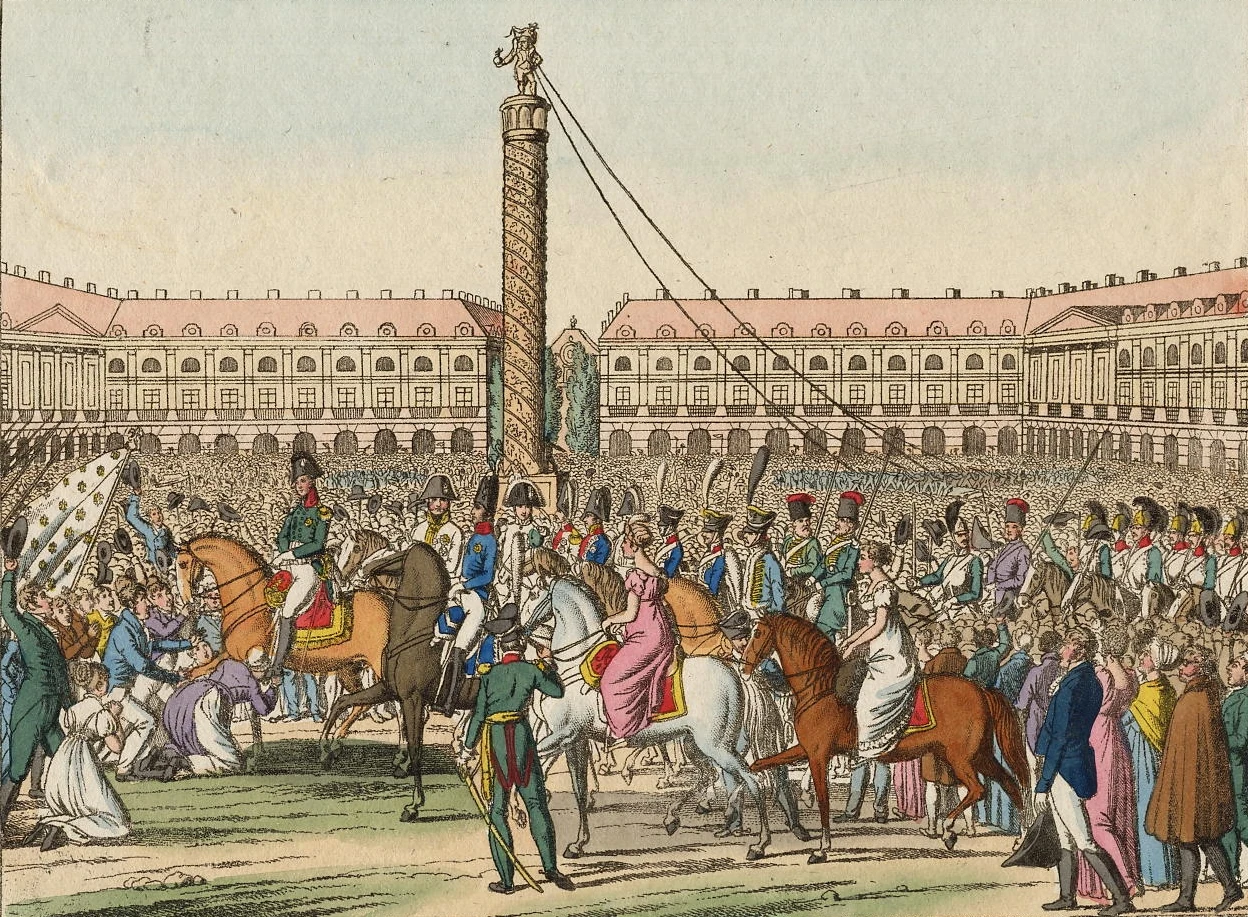 [ Wie die verbündeten Heere, an ihrer Spitze der Kaiser von Russland, und der König von Preussen, unter dem Iubel des Volks, das sich vor ihnen niederwarf, die Kleider küste, ja Damen selbst im Freudentaumel, sich auf Cosaken Pferde setzten, um den Befreyern näher zu seyn, den 31. März 1814. durch Paris über den Vandome Platz, vor Napoleons hoher Bildsäule vorbei, da sagte Alexander: "Wenn ich so hoch stände, mir würde schwindeln!" Übrigens machte sich das souveraine Volk gleich über das Denkmal her, und ein tapferer Pariser erkletterte sogar die 155 Fuss hohe Säule, um oben die Stricke zu befestigen. ]