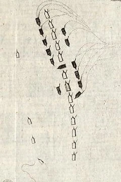 Er sah die Posizion der französischen Flotte; sah, daß blosse stürmische Tapferkeit hier nicht hinreichend war. Er entwarf also, durch sein taktisches Genie, eine der kühnsten Plane, dessen Gelingung die Vernichtung der französischen Flotte seyn mußte.