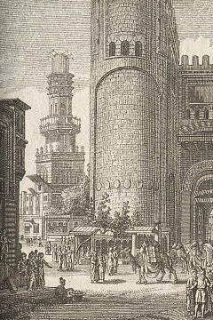 Cairo, die Hauptstadt in Aegypten, eine der größten Städte in der Welt. Sie liegt am östlichen Ufer des Nils in einer sandigen Ebene, besteht aus vier ziemlich weit von einander entfernten Theilen, Alt-Cairo, Bulak, dem Hafen der Stadt und Neu-Cairo. Die eigentliche Stadt, ohne gärten und Pflanzungen, hat 3½ Stunden im Umfang, 31 Thore, unregelmäßige und ungepflasterte Gassen, welche des Nachts am Ende der Quartiere verschlossen werden, um Unordnungen zu verhüten; größtentheils von Ziegelsteinen erbaute Häuser mit platten Dächer, gegen 250,000 Einwohner, Araber oder Mahomedaner, coptische Christen, Mamelucken, Griechen, Syrer, Armenier, Europäer, Juden xc. Man Zählt an 80 öffentliche Bäder, 300 Moscheen, Seiden-, Camelot-, Tapeten-, Schießpulver-, Leder-, Leinwand- und Kattunfabriken. Der Handel der Stadt ist sehr wichtig, da sie der Mittelpunkt alles Verkehrs zwischen Europa, dem mittelländischen Meere, Asien und Nord-Afrika ist. Hier ist auch eine mahomedanische hohe Schule. In der Nähe befindet sich eine Wasserleitung von 317 Schwibbogen. Im J. 1798 wurde sie von den Franzosen eingenommen, worüber man das Weitere unter Aegypten nachsehen kann.