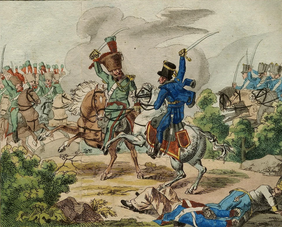 An eben dem Tage, als die Truppen über die glücklich bestandenen Gefahren sich freuten, verließ auch Rittmeister Olgyay von den Pressburger Husaren das verschanzte Lager bey Raab. Durch den Fehler einer Ordonanz blieb dieser Officier, unbekannt mit dem Entschlusse des Generals Mesko, auf den Vorposten mit 51 Husaren zurück. Mitten unter feindlichen Heeren war diese kleine Schaar verloren, verband sie nicht Schlauheit mit Muth. Am frühesten Morgen besetzte Olgyay sogleich die wichtigsten Posten, mit dem Reste der Mannschaft streifte er längs dem Flusse auf und ab, und täuschte auf diese Weise den Feind, der die Insurgenten im Lager für weit zahlreicher hielt, und erst den 17. mit einer Reiterschaar über die hergestellte Brücke bey Abda, und mit einem Trupp Fußvolk, das bey Rabapatona und Csecsen in Pletten über die Raab setzte, zugleich in das Lager drang. Olgyay zog in Eile alle seine Spähwachen zusammen, und sprengte in einer Vertiefung, die sich längs der Straße nach Ikrim hinzieht, durch das hohe Getreid noch mehr gedeckt, nach Rabapatona mit solcher Eile, daß er die zum Schutz der Plette zurückgelassene Wache überfiel, hier über die Raab unbemerkt setzte, und noch an demselben Tage Abends die Gegend von Takacsi erreichte. Schon wähnte er alle Gefahren überstanden zu haben, als er am nächsten Morgen bey der ersten Dämmerung (zwischen 2 - 3 Uhr) plötzlich auf eine feindliche Reiterschaar stieß, die gegen 400 Mann stark, von Papa herrückte. Olgyay denkt nicht an die Übermacht der Feinde, stellt schnell seine Husaren in eine Linie und stürzt auf den überraschten Feind mit einer solchen Gewalt, daß er ihn auf den ersten Anprall wirft. Der feindliche Anführer, dessen hohen Muth das Kreutz der Ehrenlegion bezeugt, sammelt eilig die Seinigen wieder, und entflammt sie durch Worte zum neuen Kampfe, als Olgyay auf ihn losstürmt. Ein heftiger Zweykampf beginnt, beyde Helden werden verwundet, die Zügel von Olgyays Pferde zerhauen; unvermögend sein Roß zu lenken, scheint dieser im Kampfe erliegen zu müssen, als er durch einen gewaltigen Hieb seinen Gegner vom Pferde haut. Allein sein wildes Roß reißt ihn mitten unter die Feinde, stürzt mit ihm, und feindliche Reiter voll Wuth drohen den Tod ihres Anführers zu rächen, als der Corporal Johann Laßlo mit den Gemeinen Johann Rado und Peter Harcsa herbeysprengt und nach dem heftigsten Kampfe die Feinde zurückdrängt. Kaum ist Olgyay mit Hülfe dieser Braven wieder beritten, als er aufs neue die Feinde angreift, und nun völlig in die Flacht jagt. Ein und dreyßig Reiter werden gefangen, und sieben Packwägen mit Waffen und Kleidungsstücken erbeutet; Olgyay trat nun den weitern Marsch gegen den Bakonyer Wald an, und zog sich von da auf Ofen zurück.