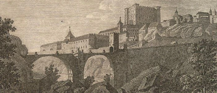 Toledo, die Hauptstadt der Provinz gleiches Namens im Königreiche Neu-Castilien, auf einem Felsen, am Tajo, der zwischen hohen und felsichten Ufern die Stadt auf drei Seiten umgibt. Die Stadt ist dieser Lage wegen sehr ungleich; das nöthige Wasser wird aus dem Flusse durch Esel auf den Felsen hinauf getragen. Toledo war ehemals sehr ansehnlich, hatte 200,000 Einwohner und war der Sitz maurischer Könige, deren alte Residenz, der Alkazar, jetzt in ein Hospital verwandelt worden ist. Die Stadt ist dermalen sehr verfallen, hat zwar viel Kirchen und Klöster, aber nur 25,000 Einwohner. Sie ist der Sitz eines Erzbischofs, der den Titel als Primas von Spanien führt, 8 Bischöfe unter sich hat, und sonst 300,000 Ducaten jährlich Einkünfte bezog. Auch ist hier eine, aber sehr unbedeutende Universität. Unter den Gebäuden zeichnet sich die in gothischem Geschmack erbaute Domkirche aus. In der Nähe der Stadt finden sich noch Ueberreste römischer Alterthümer. Es gibt hier Seidenfabriken und eine dem Könige gehörige Degenklingenfabrik.